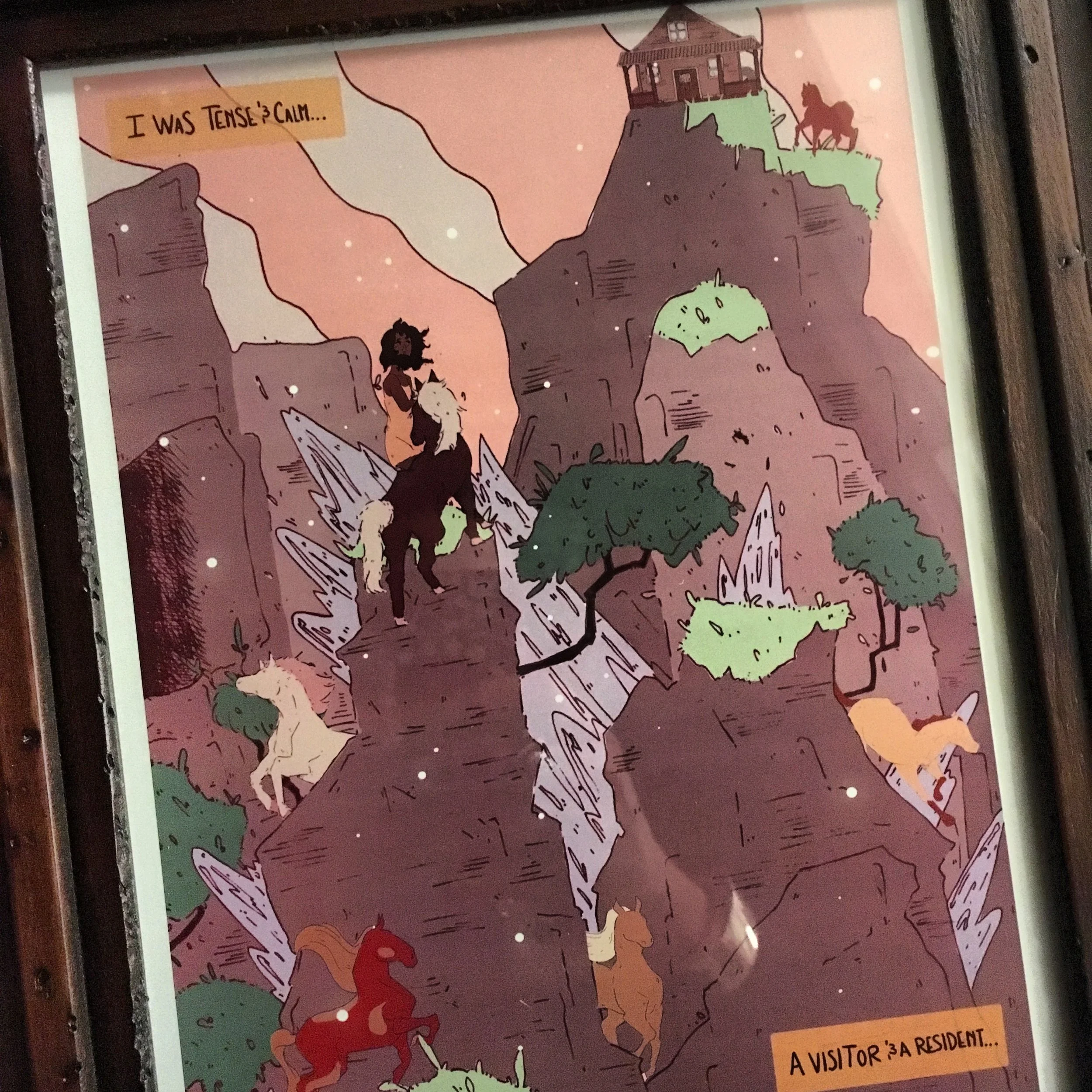 Walking between them, hands on manes, my hips to shoulders. flat hands on hips. A squeeze here and there (from them). Stamping, flickering hides. Noticed. Not unwelcome. Barefoot. I walked until my shoulders ached from holding my arms up to palm a neck or a muzzle. There were so many. The grays stood out to me, and one seal brown mare. I stood still toward the end, feeling the sandy earth, realizing I’d made it to the top of the cliff. The wind was different here, the pressure on my legs from it moving under their bodies. It swirled down from on top of my head as it crested like a wave over the face of the cliff and onto the plateau. I was tense and calm. Alert and relaxed. A visitor and a resident.