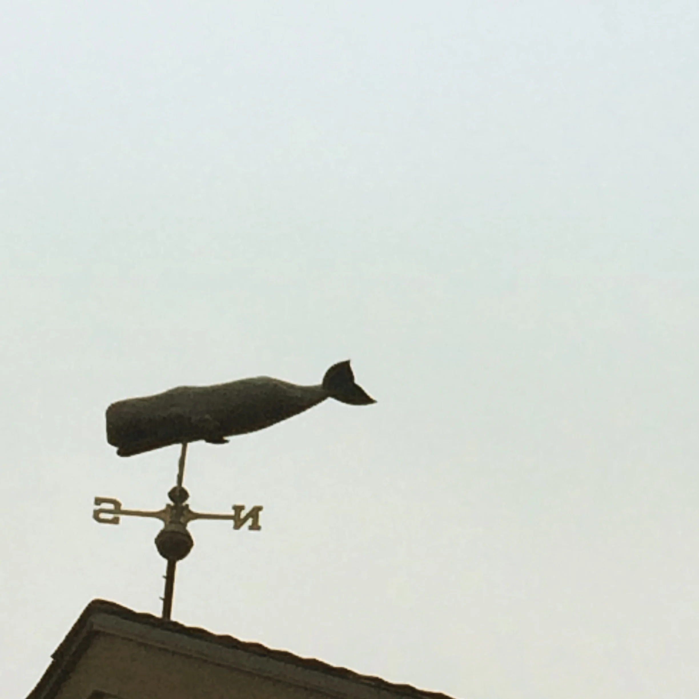 Alt-Text: gray sky with whale weathervane on a rooftop