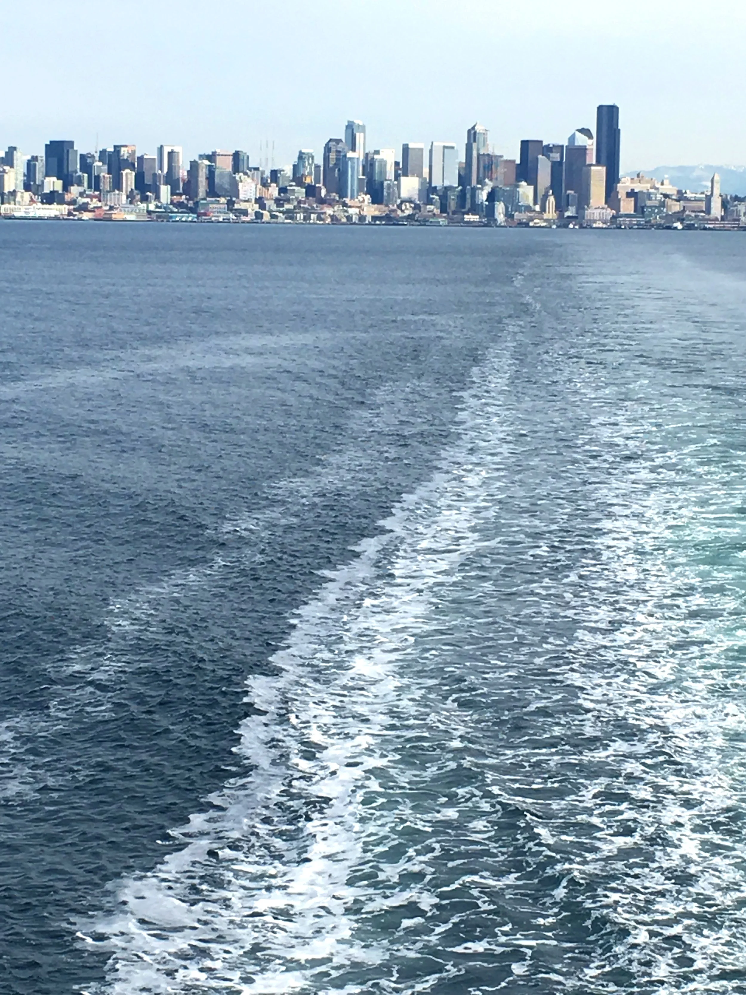 Si'ahl (Seattle) downtown skyline in background, wake from ferry in foreground, daytime.