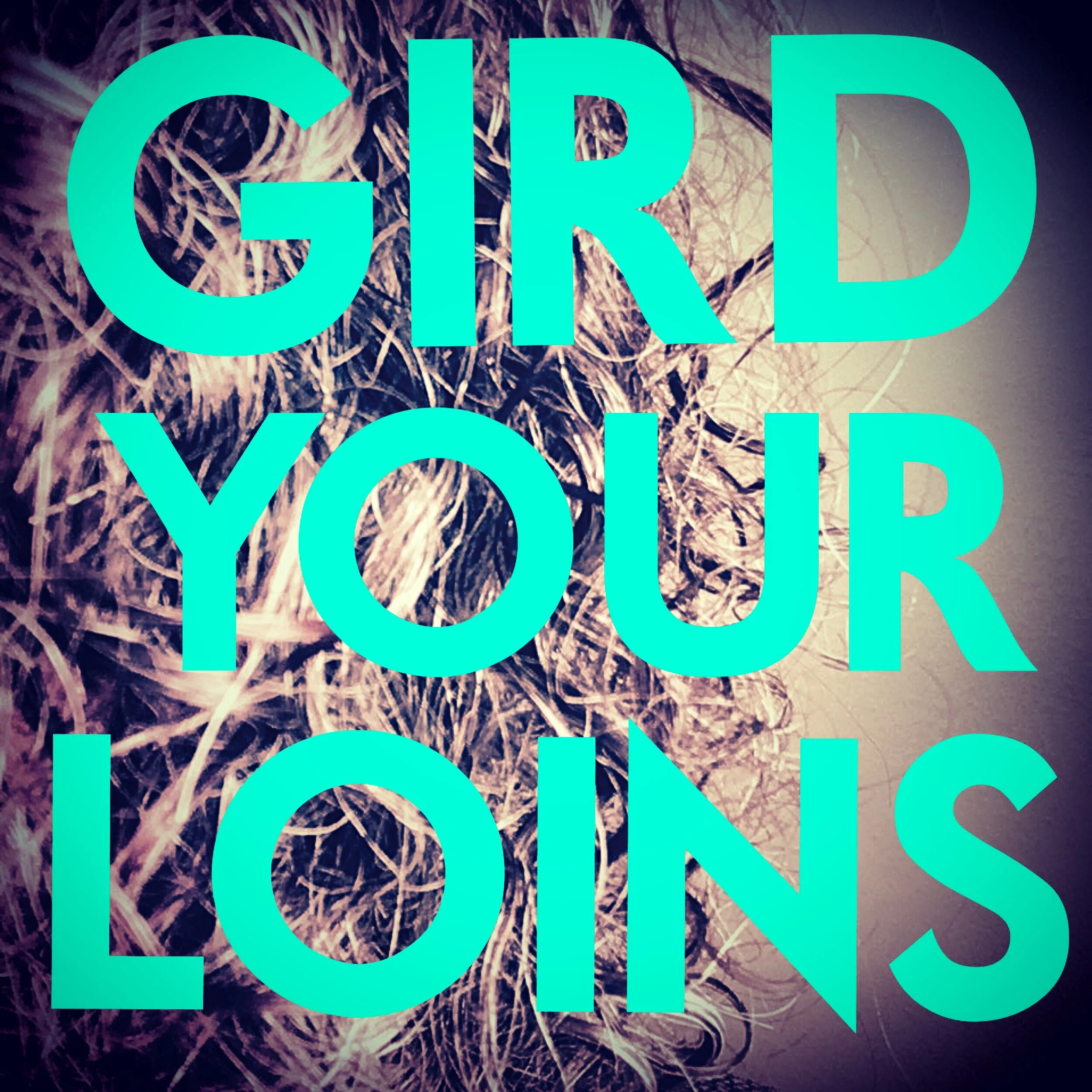 Abstract gray and black background with wavy hairlike texture with a text overlay of “GIRD YOUR LOINS”